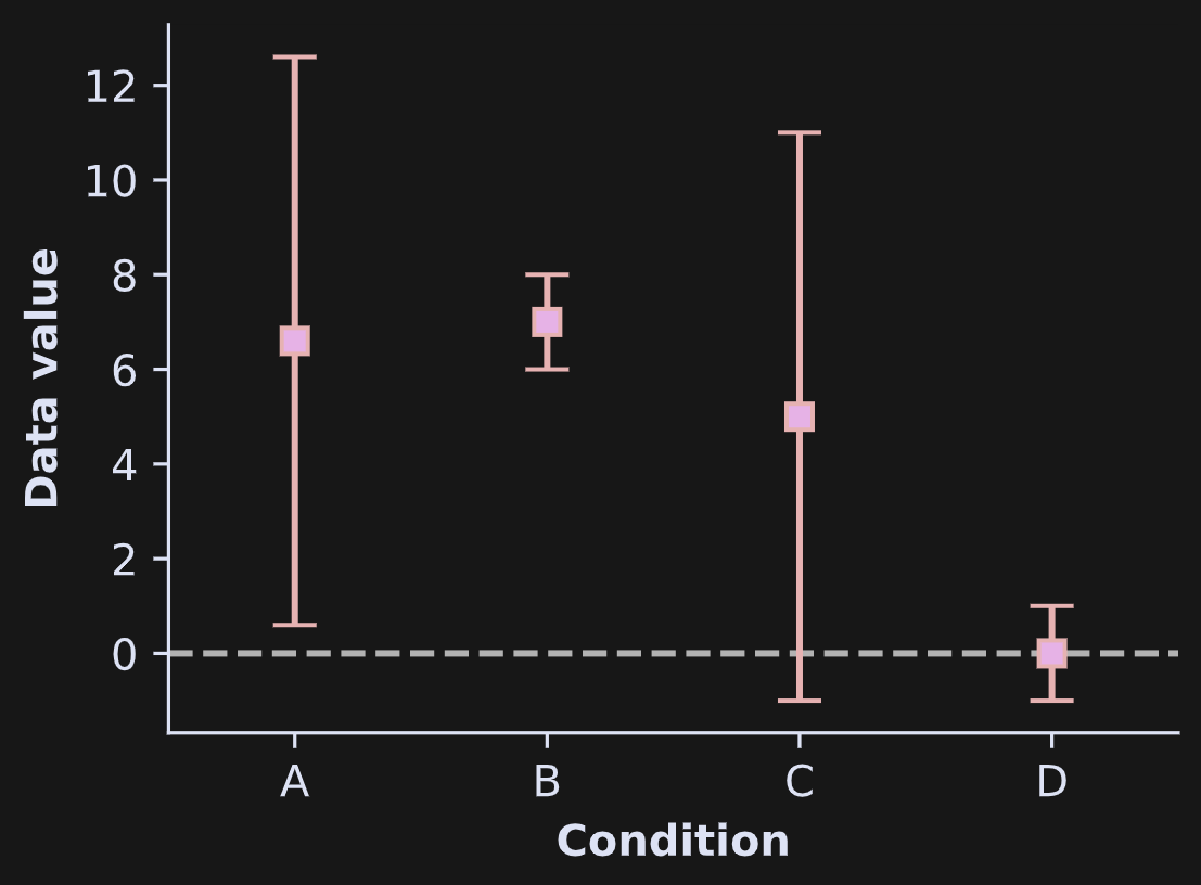 Confidence intervals are visualized either as bars or as shaded areas. In Figure 1, imagine that the boxes in the plot show the averages in each group, and the error bars indicate 95% confidence intervals. If the horizontal dashed line is the null-hypothesis value of no effect, then groups A and B would be significantly greater than zero while groups C and D would not be.