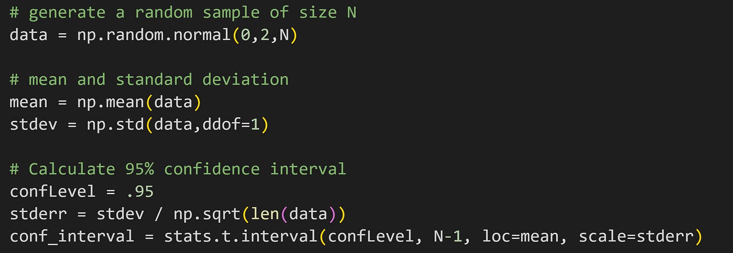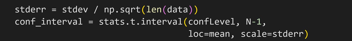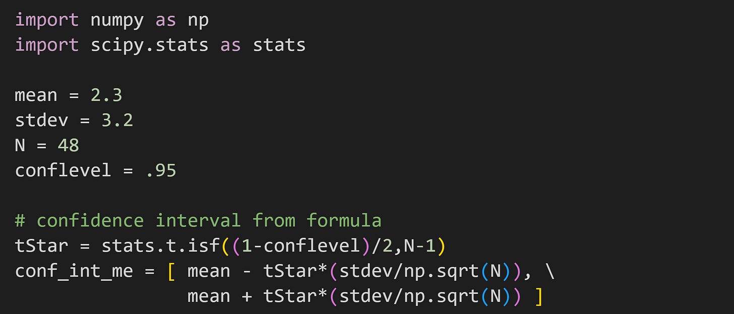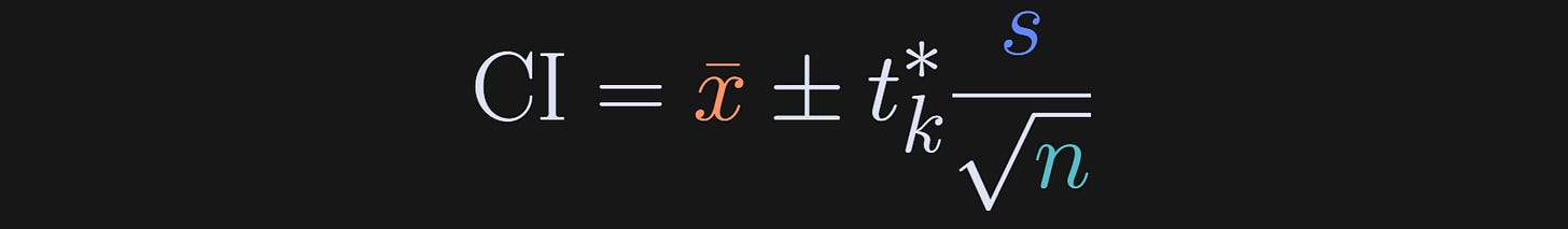 The x with a bar over it (Substack doesn’t have inline latex capabilities…) is the sample average, s is the sample standard deviation, n is the sample size — and by the way, that fractional term is also known as the standard error of the mean, SEM — and the t* is a t-value. It’s not a t-statistic from a t-test, but it does come from a t-distribution. It is the t-value that corresponds to 5% of a t-distribution with n-1 degrees of freedom. 5% corresponds to a 95% CI.