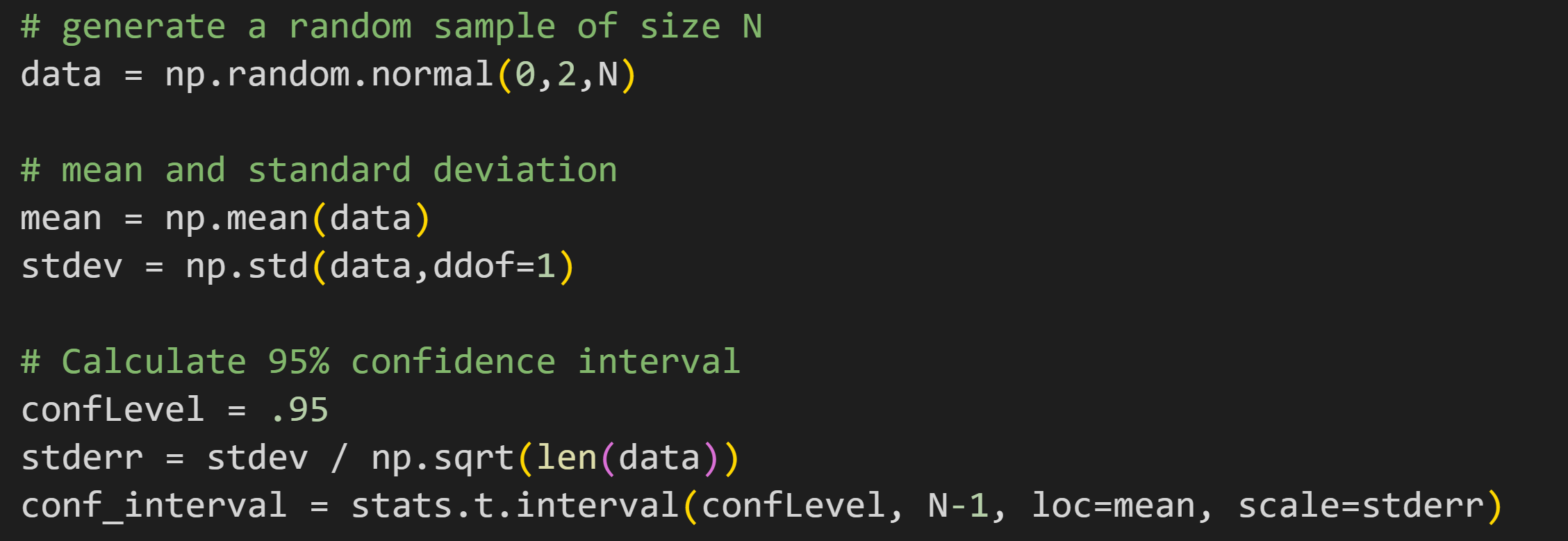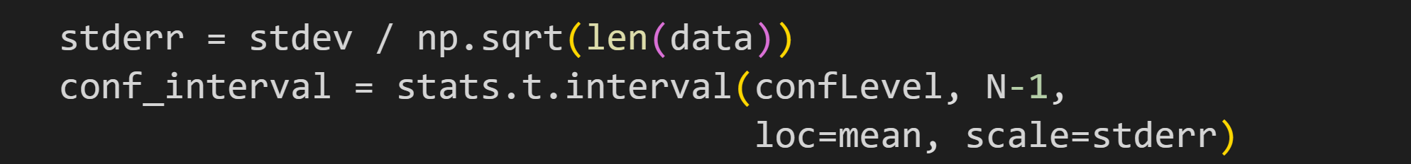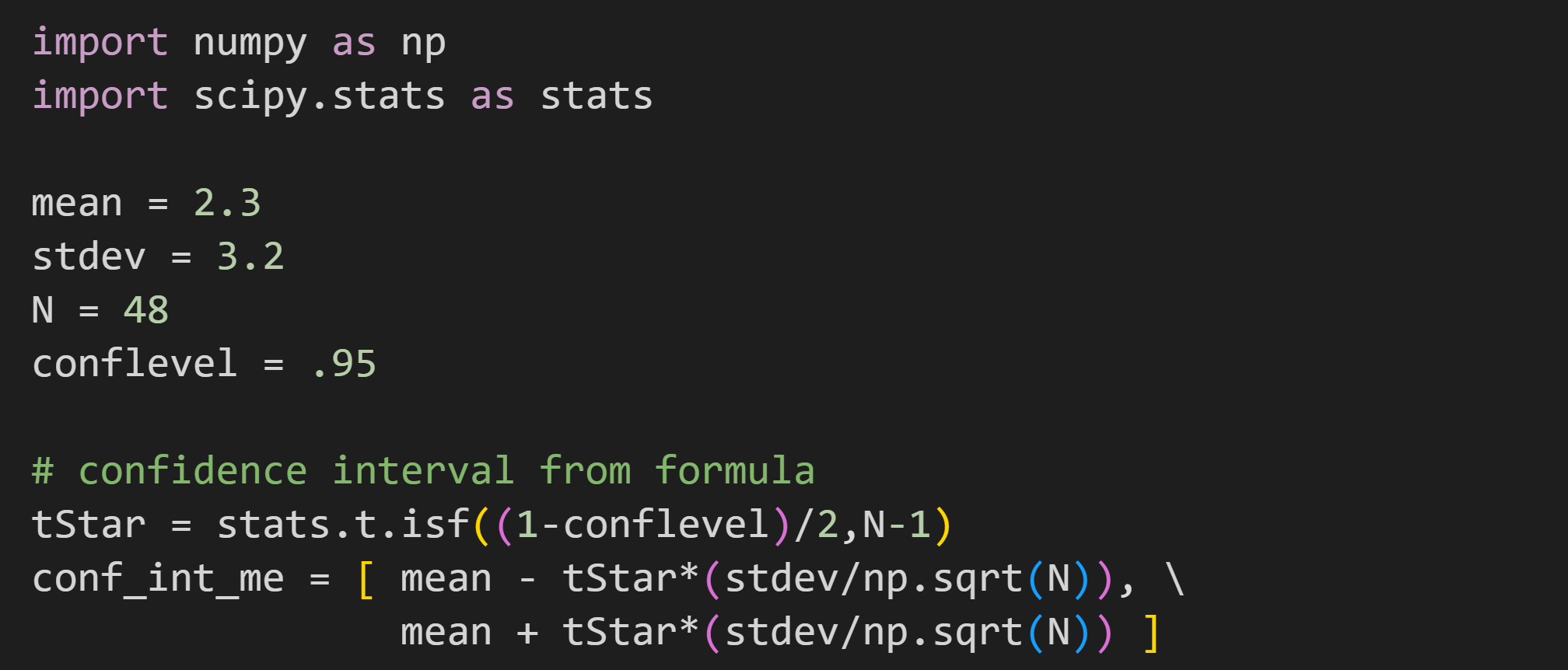 Although it’s instructive to see math translated into code, in practice its better to use the interval method that the scipy developers worked so hard to create: