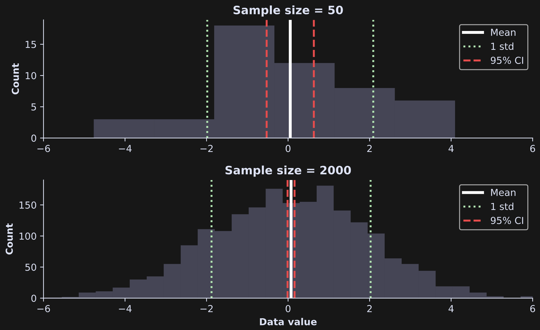 Let’s run a code demo to explore the distinction between CI and standard deviation. The idea is to simulate two datasets, one small (N=50) and one large (N=2000) and calculate their standard deviations and 95% CIs.