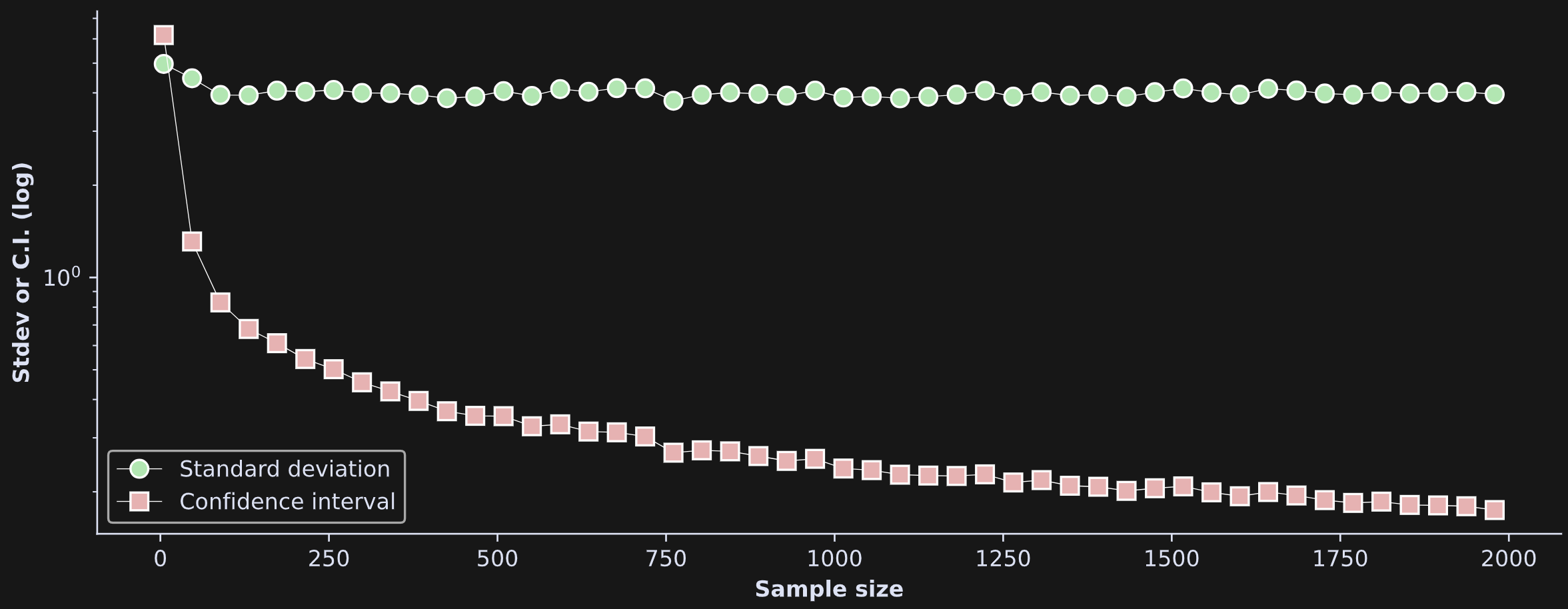 By the way: It is arbitrary that I used 1 standard deviation and 95% CI — why not .784 standard deviations and a 92.45% CI? These kinds of choices would change the y-axis values, but wouldn’t change the relationship to sample size.