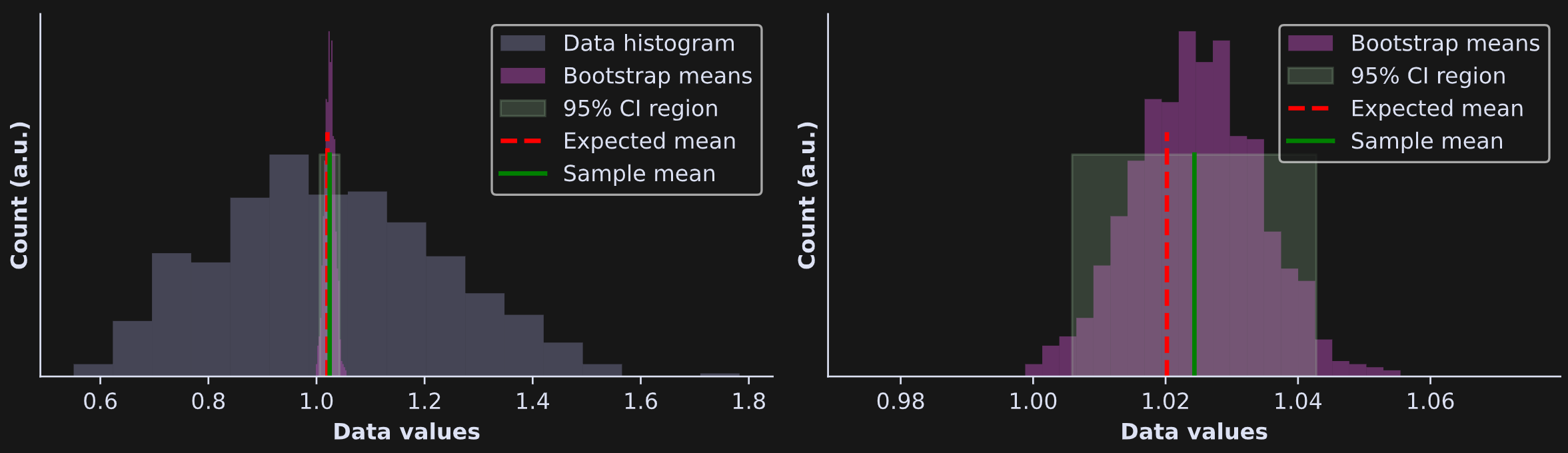 The left panel shows the same histogram as in Figure 1, but with a light green box drawn on top indicating the 95% CI bounds. To be honest, it’s really difficult to see that green box, because the CIs are so narrow. That’s why I zoomed-in to the plot in the right-side panel (note the x-axis values in the two plots).