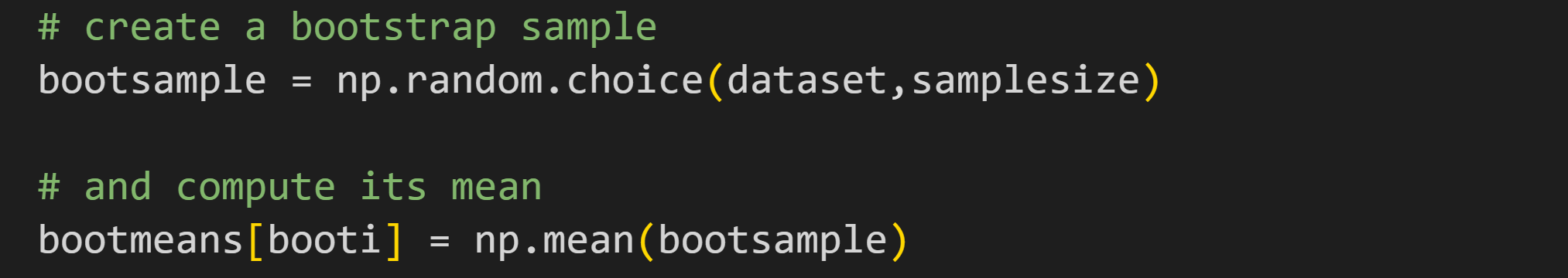 In other words, there is uncertainty associated with the sample average that the random resampling reveals. That’s not an artifact — it is intrinsic to the dataset but you can’t see it just by looking at the data; you need to resample to observe that variability. As a counter-example, imagine a dataset [2,2,2,2]