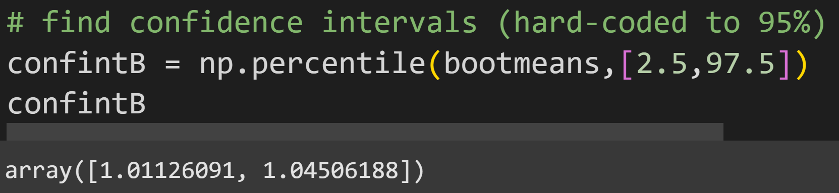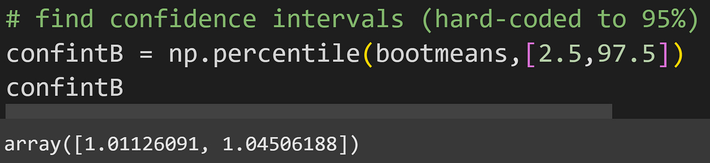 function to get the 2.5% and 97.5% of the distribution. In other words, 95% of the bootstrap means were in between 1.011 and 1.045.