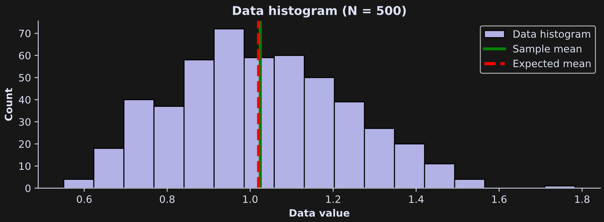 Figure 1 below shows a histogram of the data, the theoretical expected average (dashed red line) and the sample average (green line).