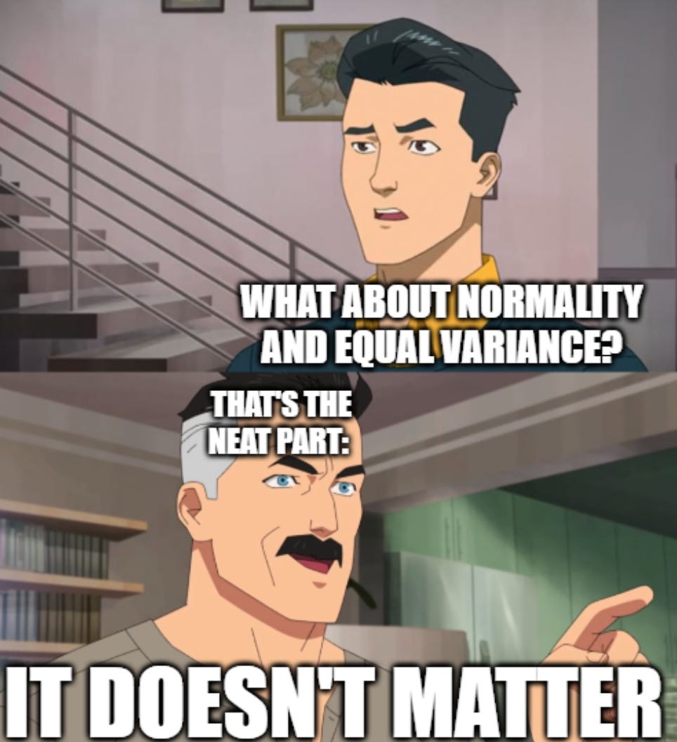 What about other assumptions, like normality and equal variance? Those don’t matter! Violate those assumptions to your heart’s delight :)