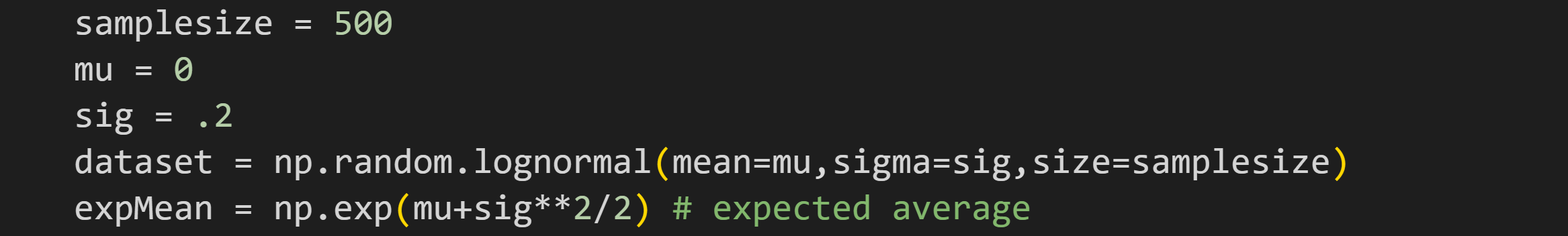 Let’s work through a demo. I will generate random numbers from a lognormal distribution with a known population mean. (A lognormal distribution is defined as exp(x) where x is normally distributed numbers.)