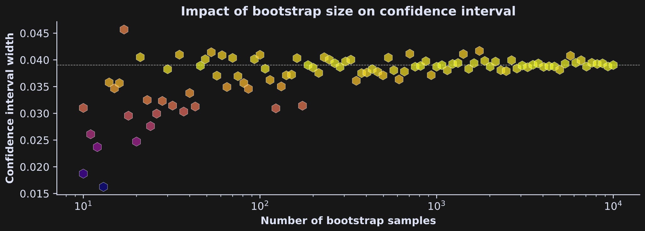 To explore this idea, I ran an experiment with the simulated data from earlier. I re-calculated CI widths in the same data, in a for-loop over 10 to 10,000 bootstrap samples. Those results are in Figure 4. CI width generally stabilized as the number of resamples increased, although there was still variability even going up to 10k samples.