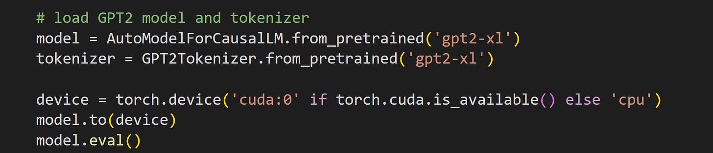 For this demo, I’ll use GPT2-XL. It has 1.5 billion parameters — small enough to be convenient to work with, but big enough that we can find some interesting trends in a laminar profile analysis (that is, examine how the results vary over the 48 transformer blocks).
