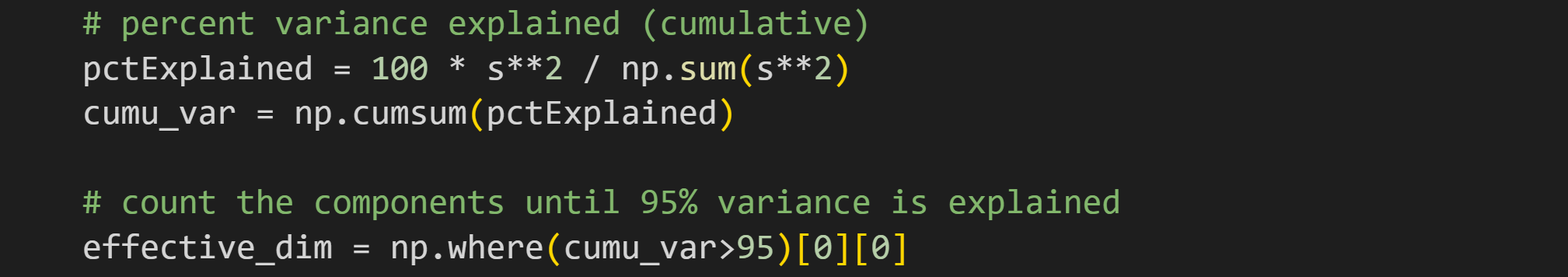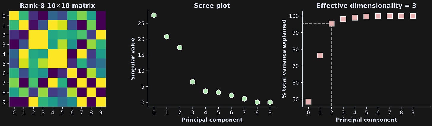 How is it possible that the effective dimensionality is only 3? That’s due to the difference in thresholding: I defined the effective dimensionality as 95% of the variance. Notice in the raw singular values plot (middle panel) that the top three components have large values and the next five are relatively small. Changing the threshold from 95 to 99 increased the effective dimensionality to 6 (not shown here but you can do it in the online code). This shows that the interpretation of effective dimensionality is impacted by the threshold parameter.