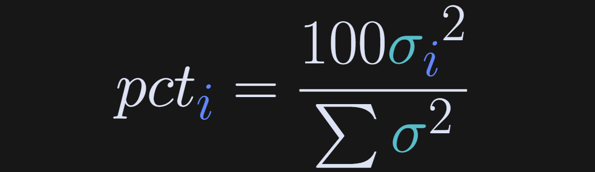 pct is the percentage of total variance explained by the i-th component, and σ is the singular value. In English: The sum of squared singular values is the total variance in the data, and therefore, the fraction of total variance from each individual singular value is the proportion of variance that component accounts for.