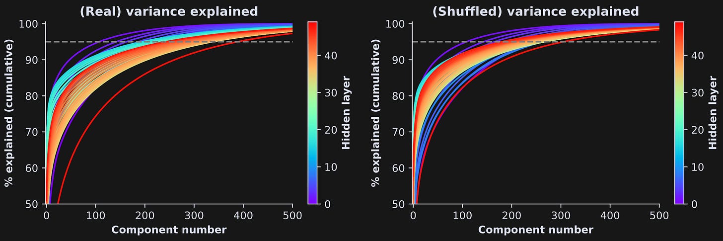 That’s for one transformer block. Figure 7 below shows the same result for all the transformer blocks, and for the real (left) and shuffled (right) tokens. In the plots, each line corresponds to the cumulative variance explained for one layer, color-coded such that higher numbers (towards yellow/red colors) correspond to transformers that are deeper into the model.