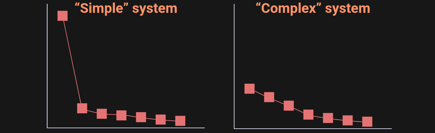 Here’s how to interpret the singular value spectrum: A simple system has few “moving parts” and therefore most of its variance is captured by one or a small number of components. In contrast, a complex system has a lot of distinct moving parts and subsystems, and therefore its variance is distributed over multiple separate components. This is diagrammed in the figure below.