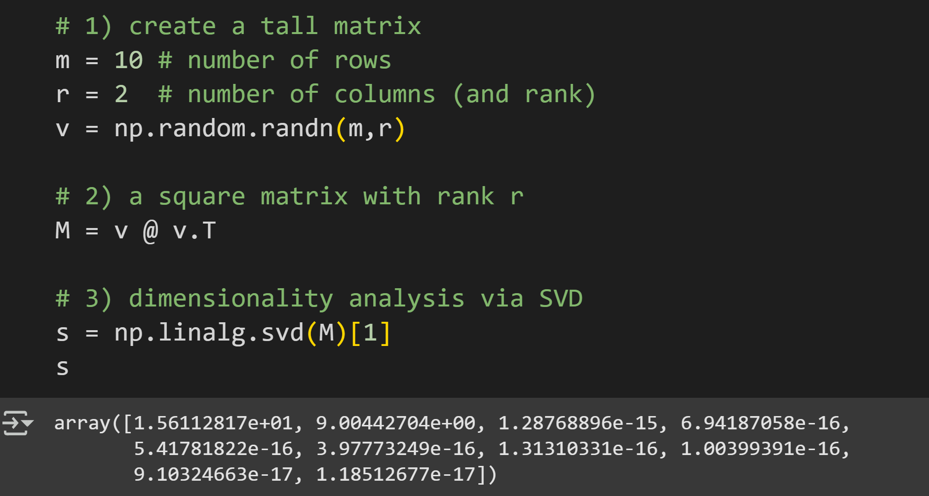 Before getting to the LLM, I want to have a short demo with a small random-numbers matrix. This will allow you to focus on the code and mechanics before worrying about the complexity and interpretation of a language model. The code below (which comes from the github code file) creates a 10x10 matrix and extracts its singular values.