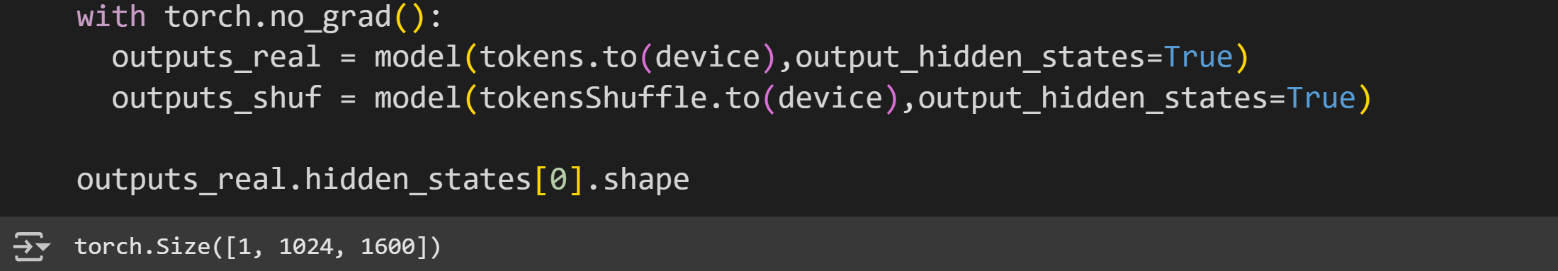 The code below pushes the tokens through the model (after moving the tokens to the GPU) with different model outputs. The argument output_hidden_states