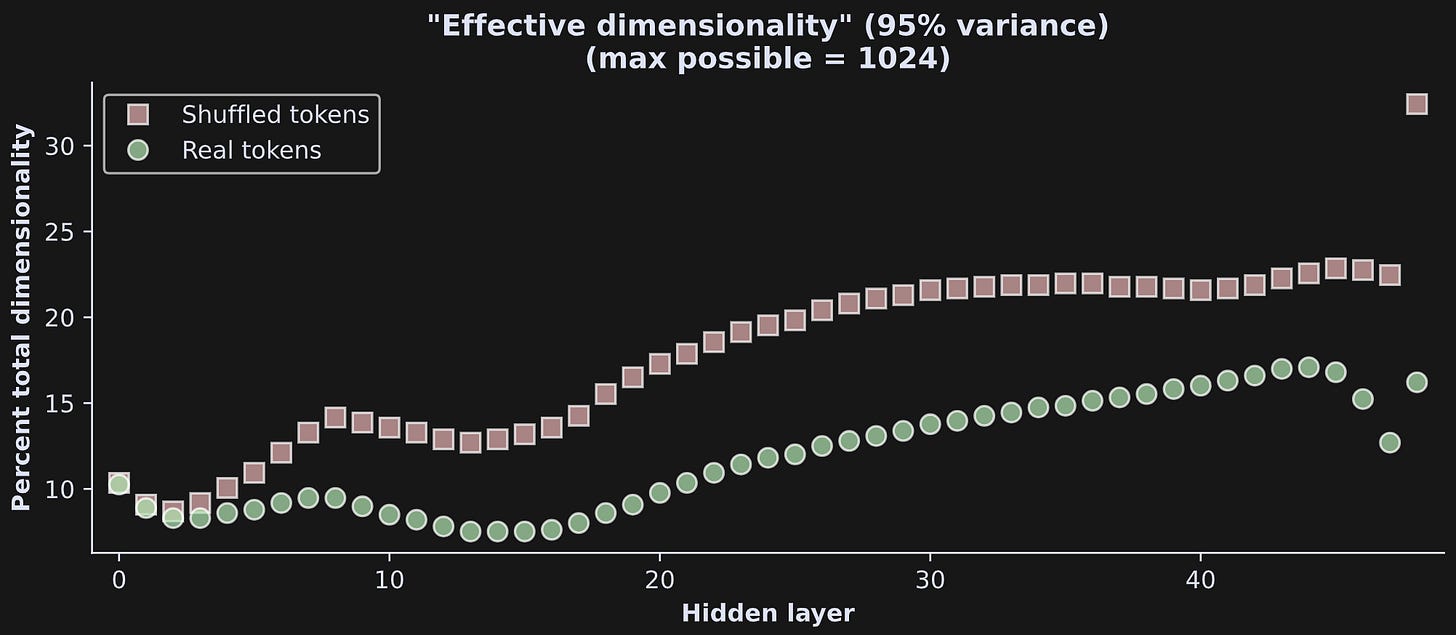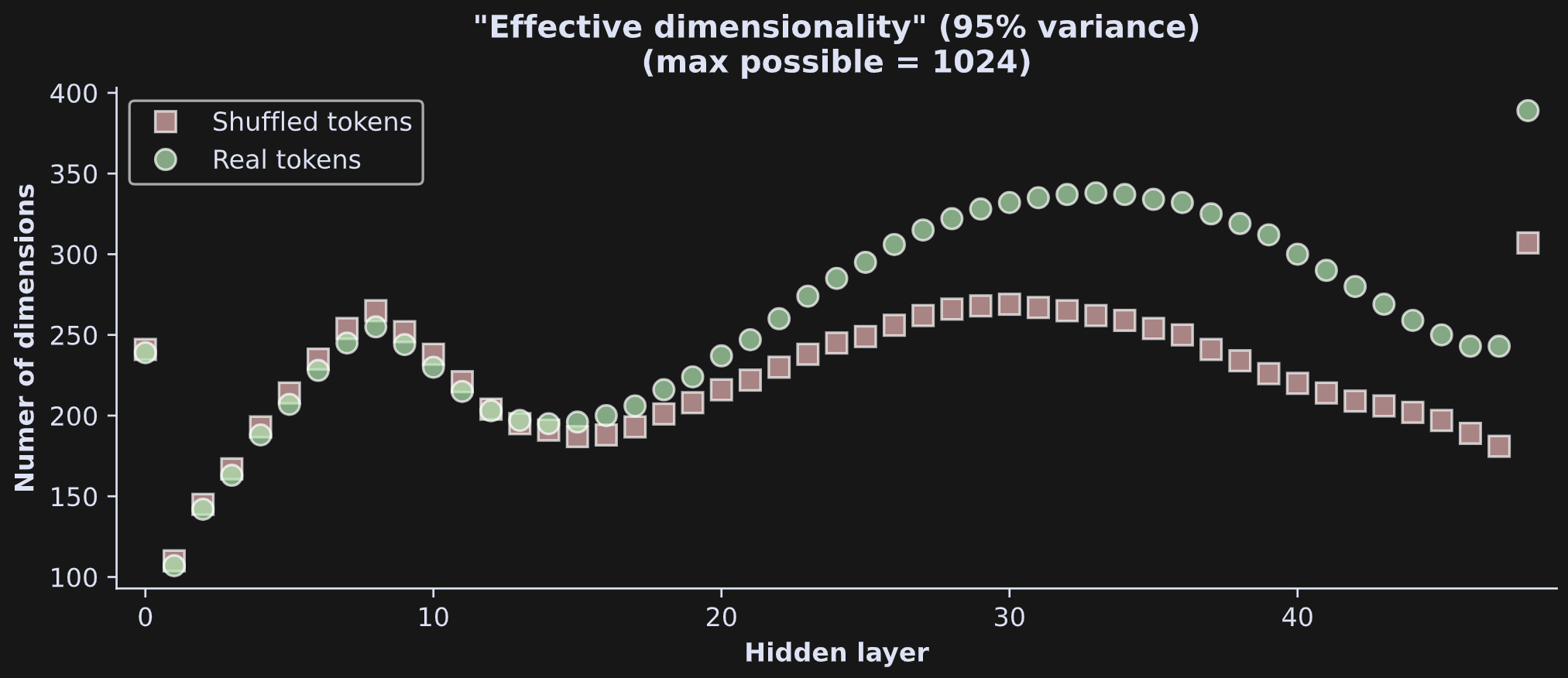The real and shuffled token sequences have comparable dimensionality earlier in the model, and diverge around half-way through. The intact sequence allows the model to bring more world-knowledge into play, which requires additional complexity and processing space.