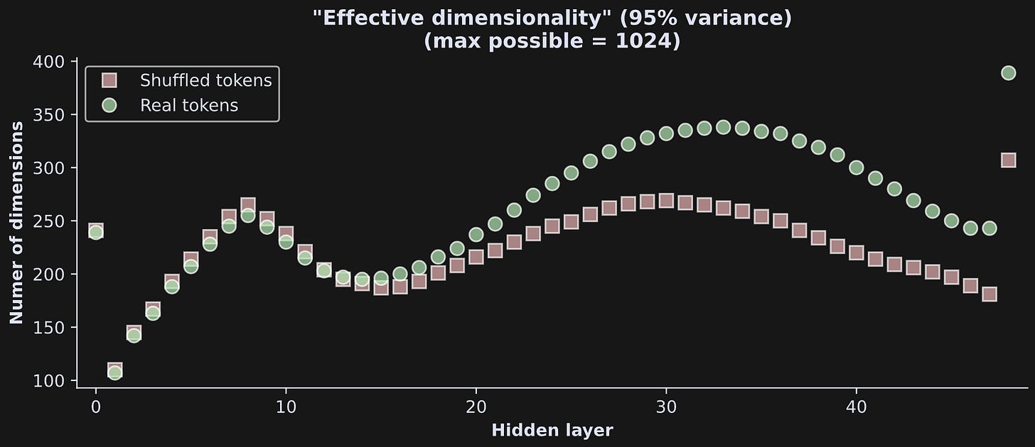 The transformer blocks show an interesting alternating pattern of increased then decreased dimensionality, reflecting transitions in how the model processes and contextualizes information. Smaller effective dimensionality suggests that the model has achieved a compacted representation of the tokens, i.e., that the patterns and structure in the text have been integrated to represent the same information in a smaller space. Subsequent increases in dimensionality reflect the model bringing on additional context and world knowledge that was not present in the original tokens.