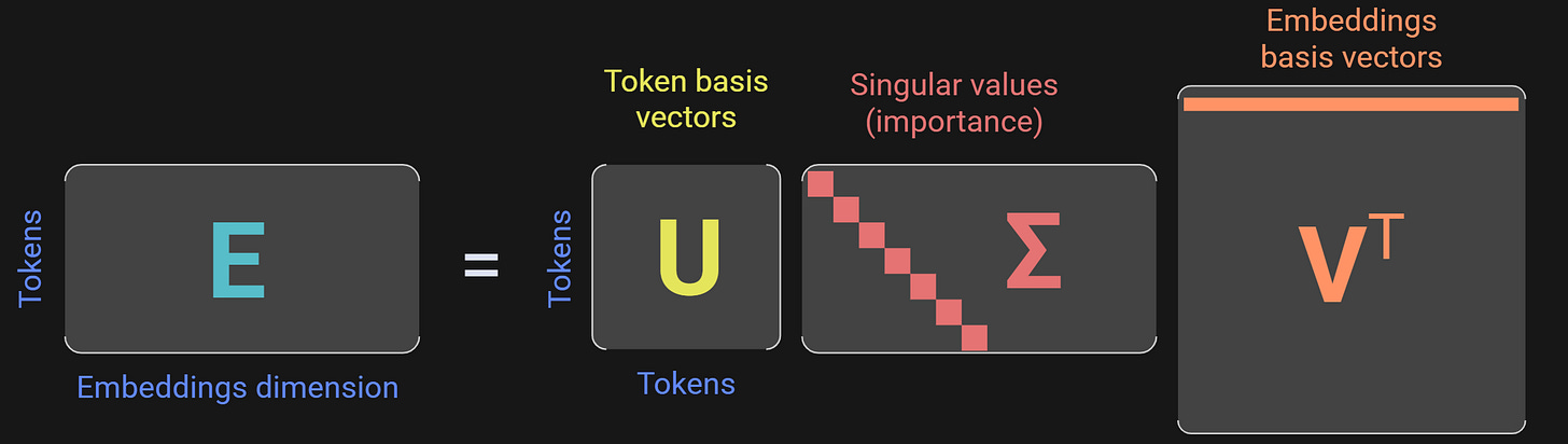 The embeddings vectors are mostly contained in <350 dimensions. Is that a lot or a little? 300 dimensions seems like a lot, but the maximum possible dimensionality is 1024 (the maximum possible dimensionality is the smaller of the number of tokens or the number of embeddings dimensions). That means that only around a quarter to a third of the total available space in the model is occupied. What is the rest of that space doing?