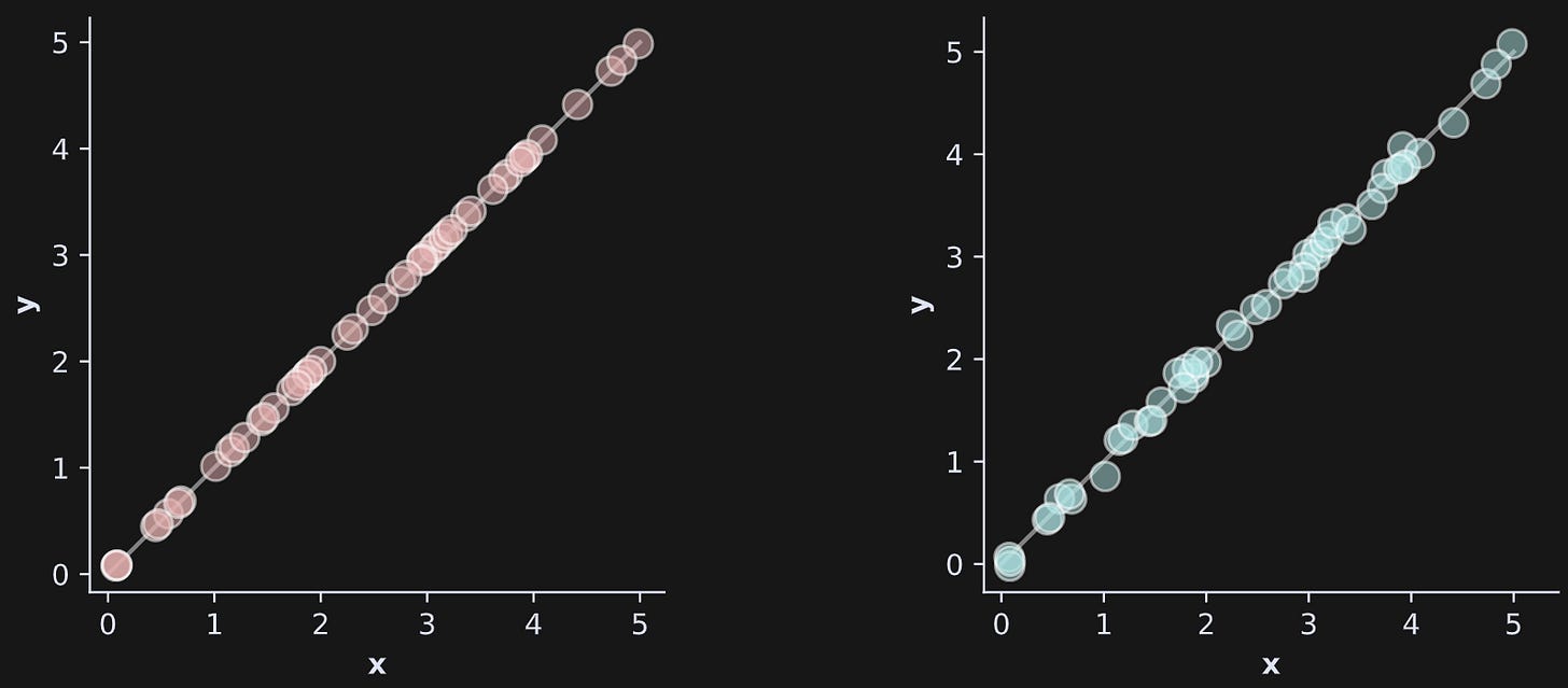 The right panel is a little more interesting and ambiguous. The dots do not lie exactly on the line. What is the effective dimensionality of that dataset?