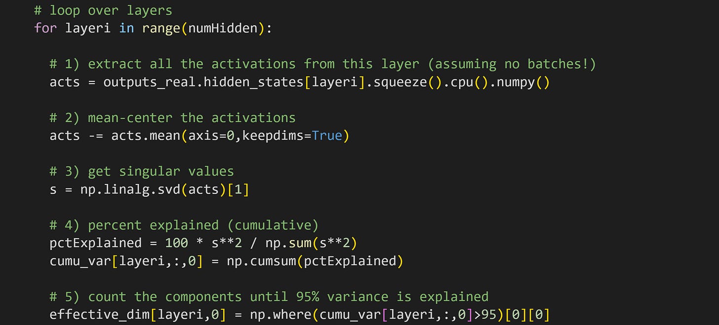 Effective dimensionality analysis, defined as the number of components it takes to account for 95% of the total variance in the internal activations for this transformer block (hard-coded here but it’s soft-coded in the code you can easily adjust the threshold). Remember that the singular values come out sorted descending, such that the largest values are always in the beginning of the vector.