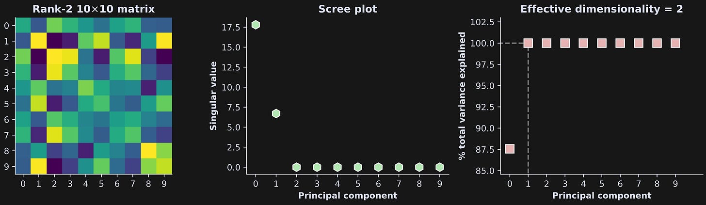 ) will be a 10x10 matrix with rank=2. The theory and proof for why that is the case is not hard to understand, but it does require some background in linear algebra.Here I extract the singular values via the numpy