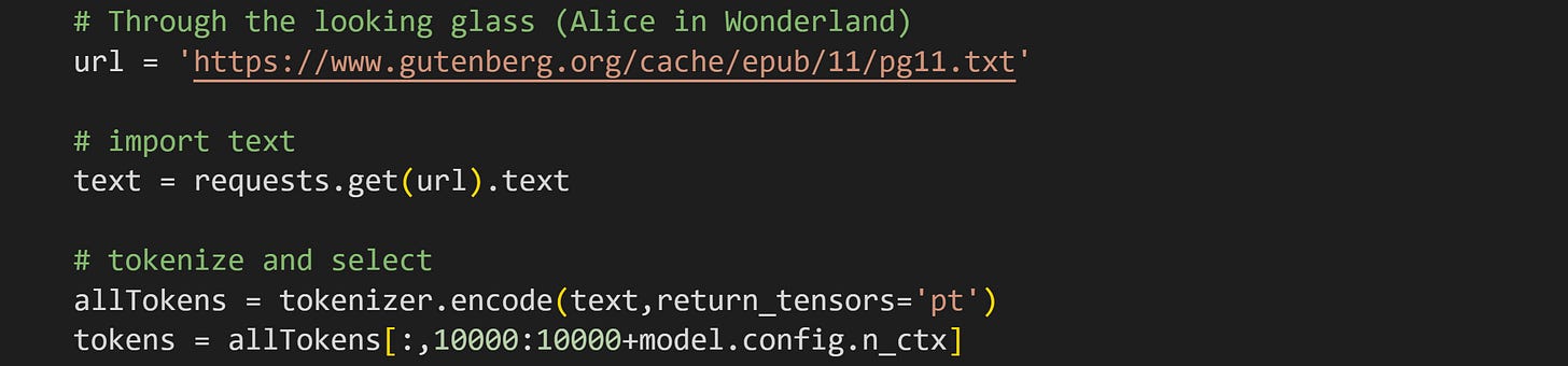 The code extracts 1024 tokens from the text (1024 is model.config.n_ctx