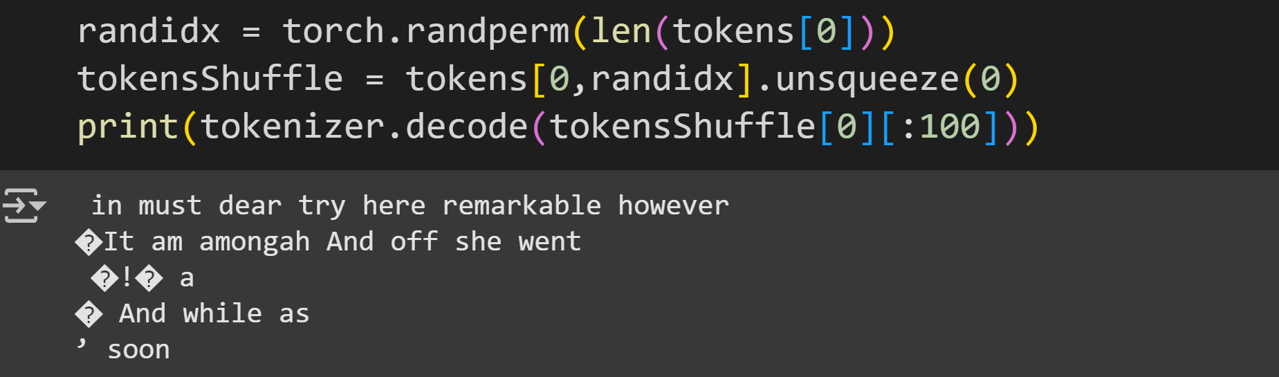 I’m also going to use the same tokens after randomly shuffling them. That is, the model will see the exact same tokens, but in a randomized order. It’s analogous to the difference between “I went to the store to buy chocolate” and “to go store buy I chocolate went the.” Same words, different order.
