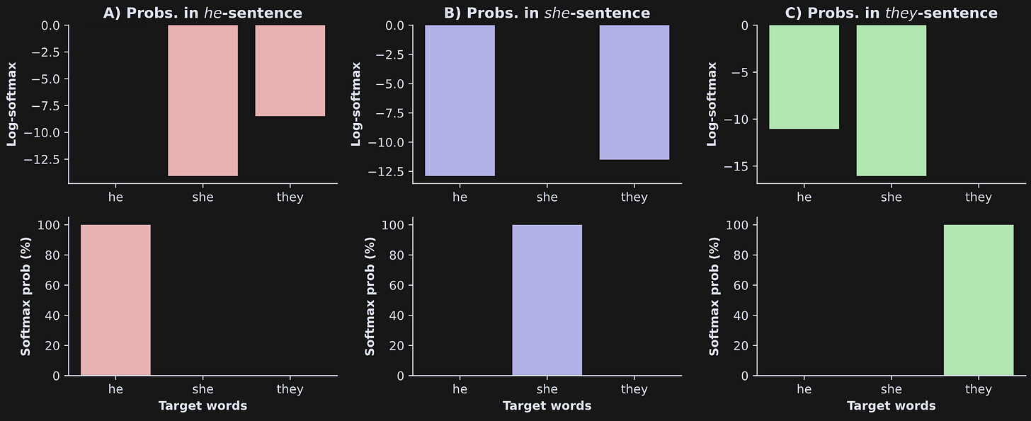 The key findings here are that the probability of “he” is highest in the he-sentence, “she” in the she-sentence, and “they” in the they-sentence. It looks like the other targets have zeros, but they’re just very small. Likewise, it seems as if the target values are missing bars in the top row, but that’s because the log-softmax values are so close to zero (the log of zero is one).