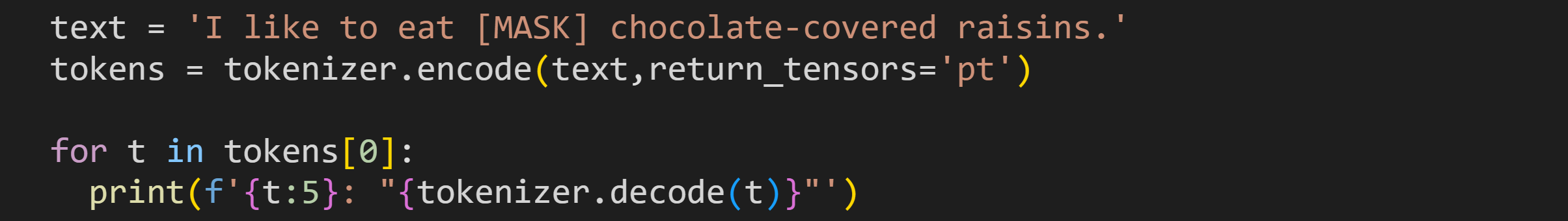 [MASK]is a specific token used when training BERT to predict masked tokens.[CLS]stands for “classification” and is automatically inserted before each text.[SEP]is for “separator” and is automatically added after each text. The CLS-SEP pair bookends text that BERT uses in classification tasks.The three special tokens have indices 101, 102, and 103. If you do a lot of language modeling, you’ll start to recognize the special token indices.