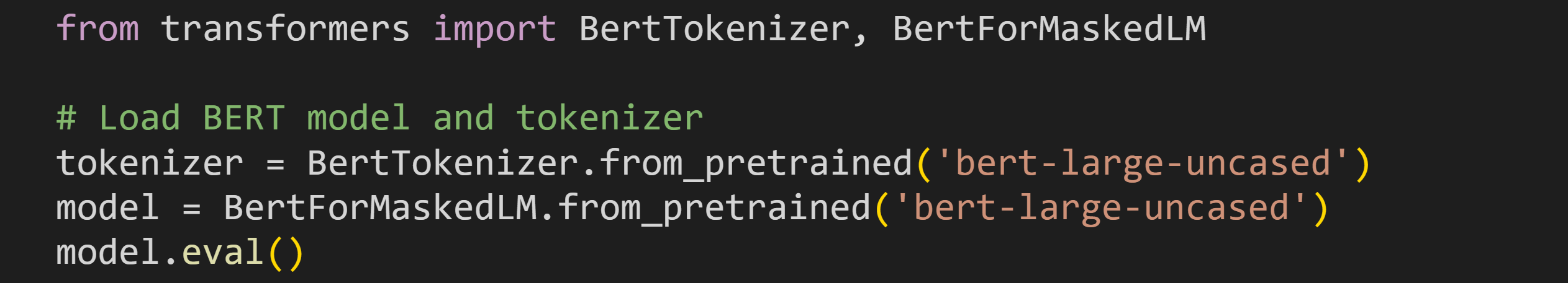 That code (here again is the link to the online code file) downloads the BERT tokenizer and model, and switches the model to evaluation (eval) mode. Eval mode disables some calculations that are used only when training models. The model name is ‘bert-large-uncased’. “Large” is a model variant (it has the same architecture but more parameters as a smaller version), and “uncased” means it ignores capitalizations: The model does not distinguish between “The”, “the”, and “tHE”.