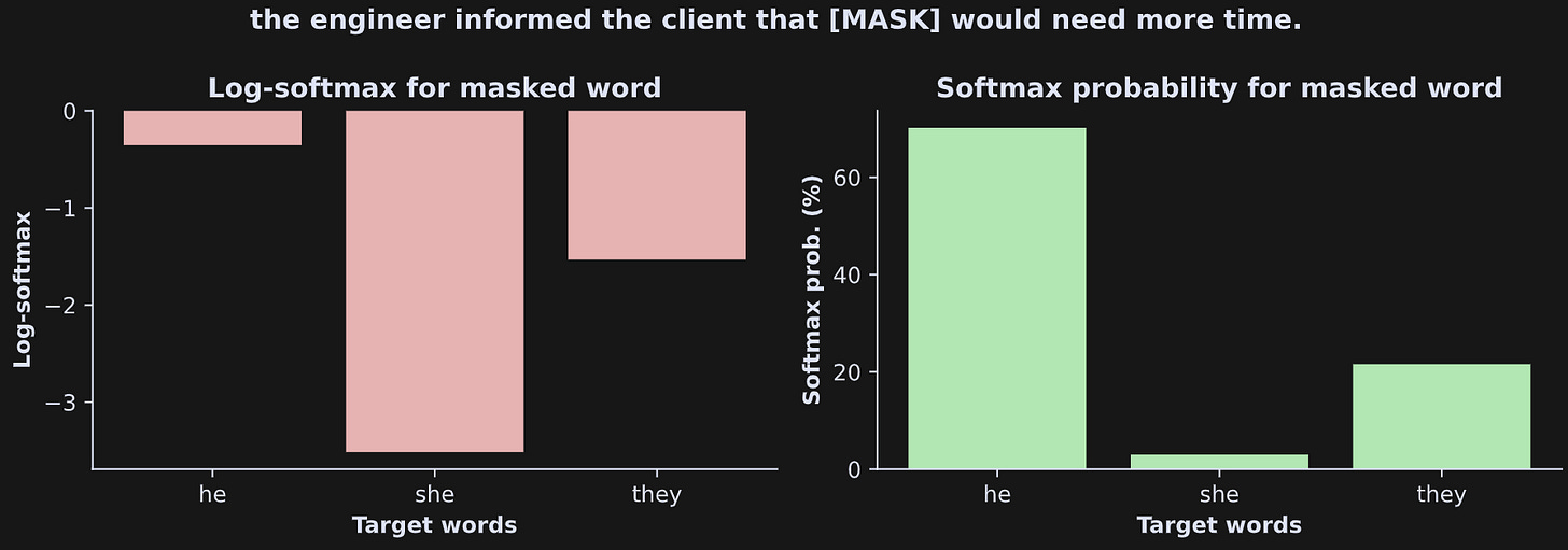 You can quantify the bias as the difference in log-softmax for “he” versus “she”. You’ll see that in Post 2 of this series.