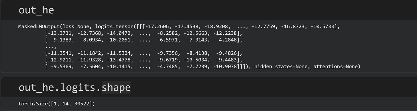 The size of the out_he.logits matrix is 1×14×30522. The “1” indicates the number of sequences we’ve put into the model. Technically I could have put all four sentences into the model simultaneously, but I decided to run it four separate times to have four different variables, to increase clarity in the code. That does increase calculation time, but for a small model with a tiny amount of text, it’s a difference of a few seconds.