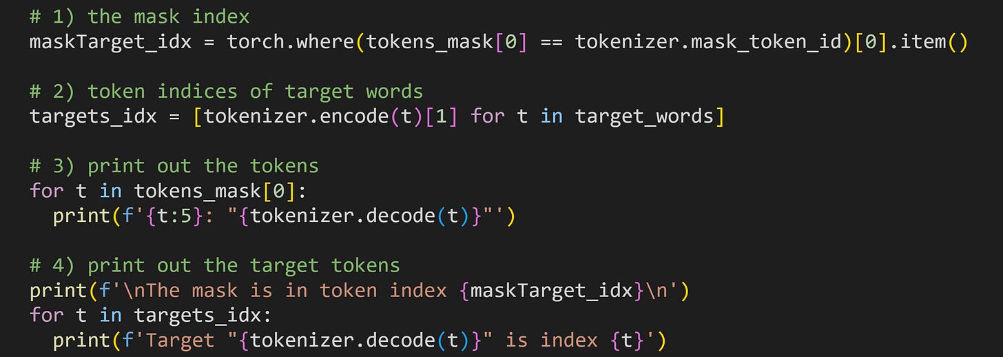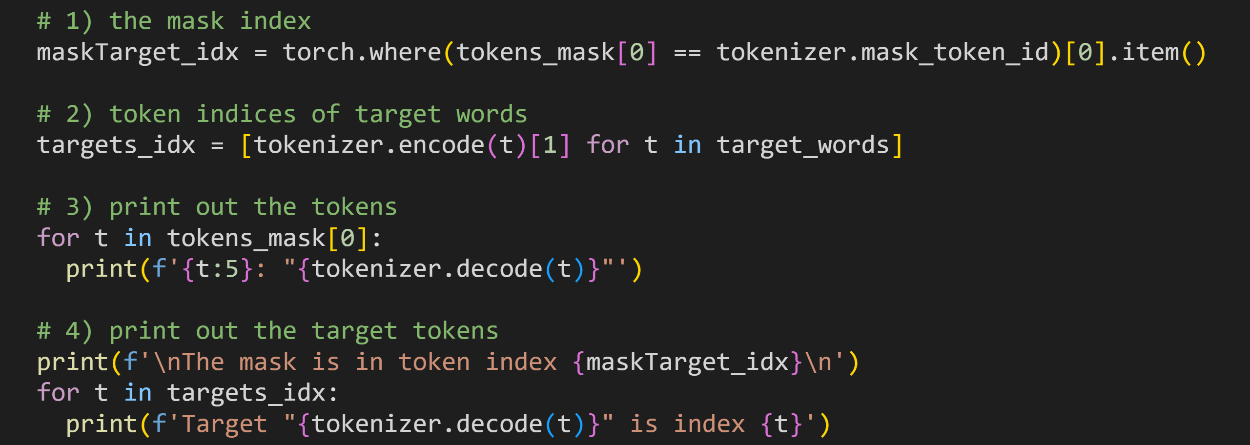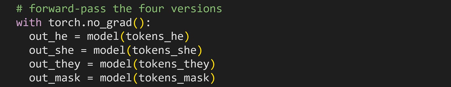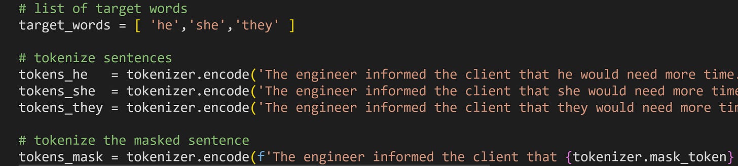 This code finds the position of the mask (and, therefore, also the words “he”, “she”, and “they”) in the sentence. We need that information to quantify the bias.