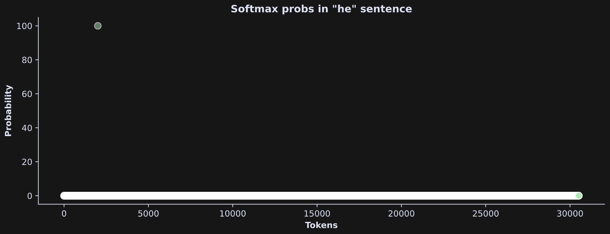 That’s pretty remarkable — out of 30,522 possible vocab tokens, one has a probability close to 100% while the rest have probabilities near zero.