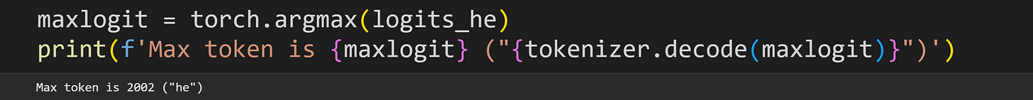 Now that we have a model and tokenizer, we can push some text through the LLM and get the output logits. Pushing tokens through a model and getting logits is called a forward pass or — in the parlance of LLMs — prompting.