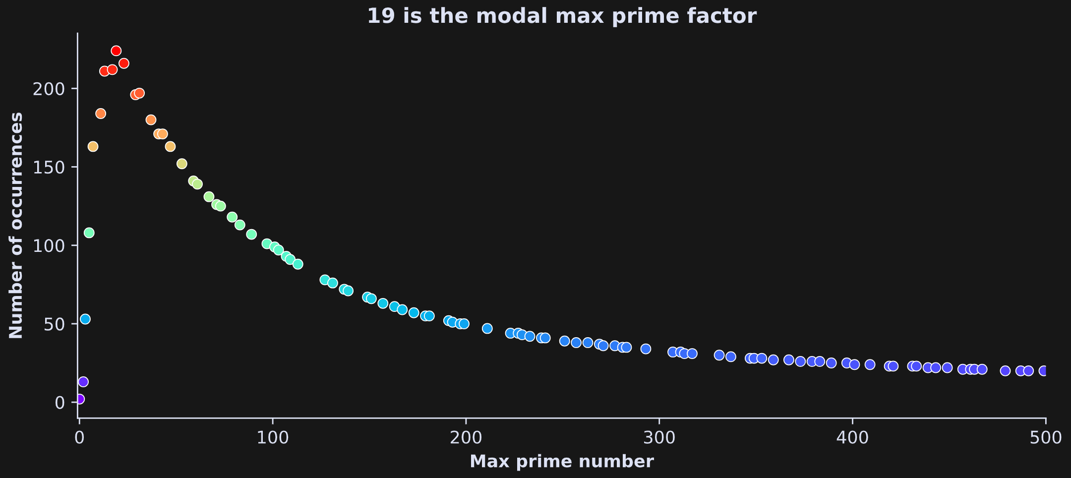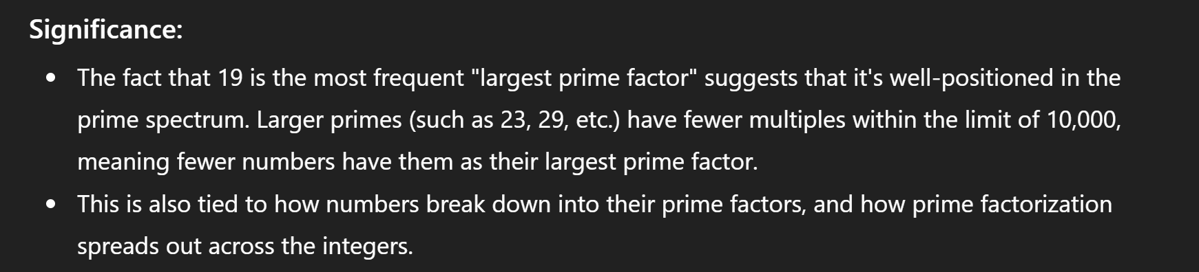 The plot below shows the frequencies of maximum prime factors. It shows the number of integers up to 10k that have the x-axis value as the max prime factor.
