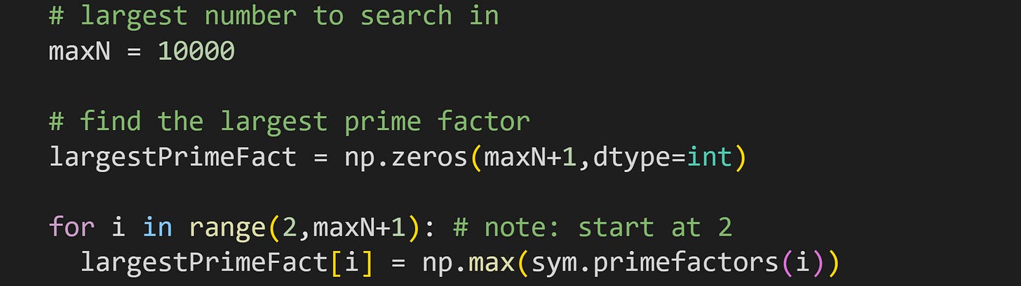 The procedure is quite simple: Loop over integers, use SymPy’s function primefactors() to get all prime factors, and then store the largest of those factors. The function returns an empty list for integers 0 and 1, which causes np.max() to crash. That’s why I start the for-loop at 2.