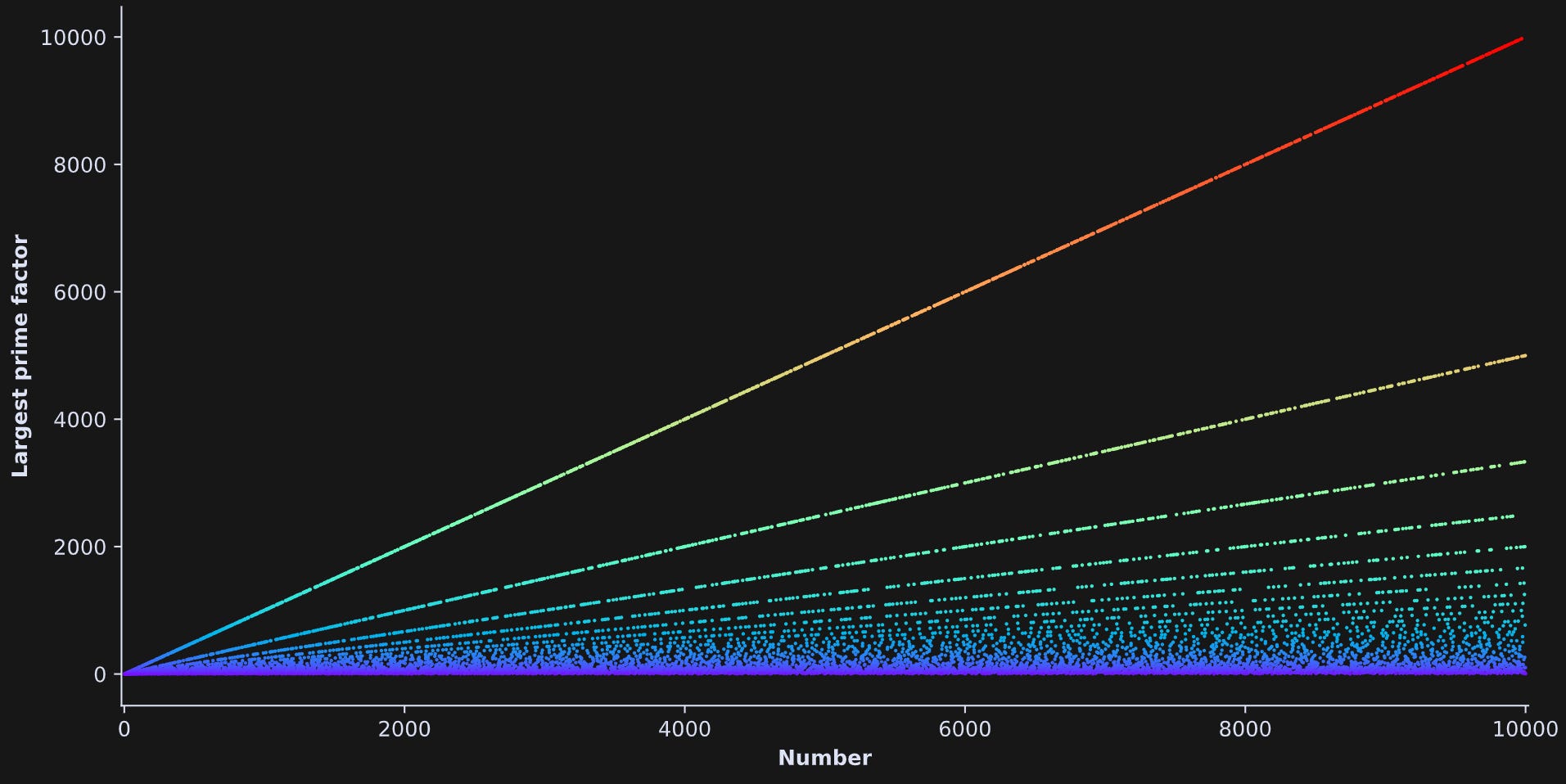 The figure below shows the largest prime factor for the integers 2 through 10,000.