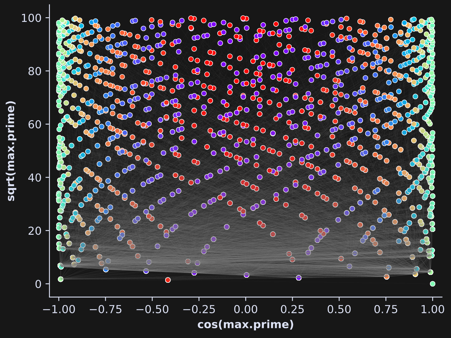 Out of curiosity, I also plotted the cosine of the max prime factors by their square root: