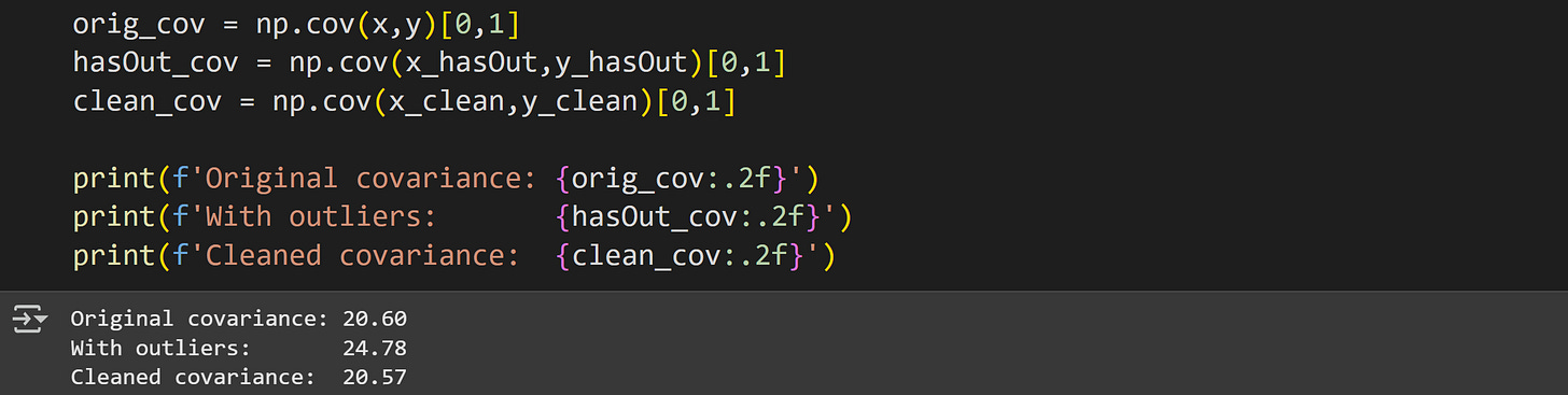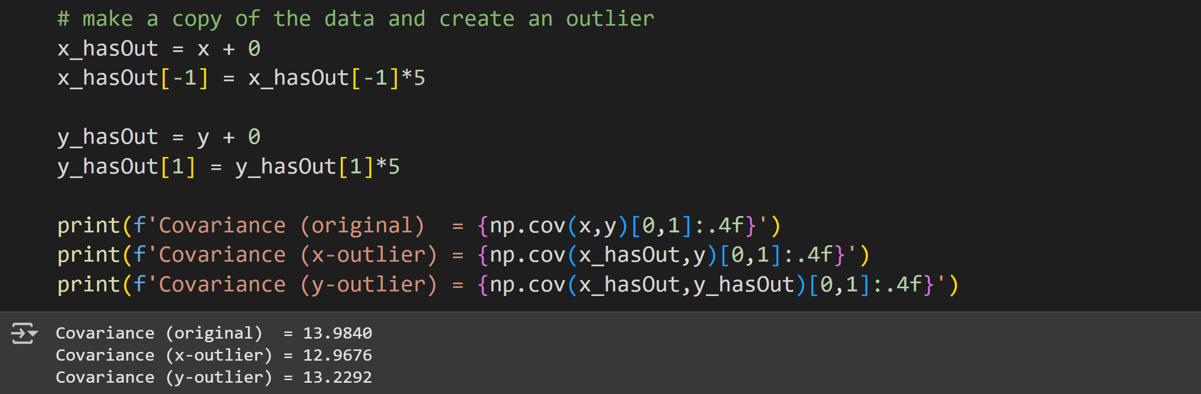 A strange thing happened there: I introduced an outlier by redefining one value to be 5x (using a copy of the data to preserve the original data; that’s good coding!), and that outlier inflated the covariance. But then I introduced another outlier to the other variable, and that actually partly corrected for the first outlier!