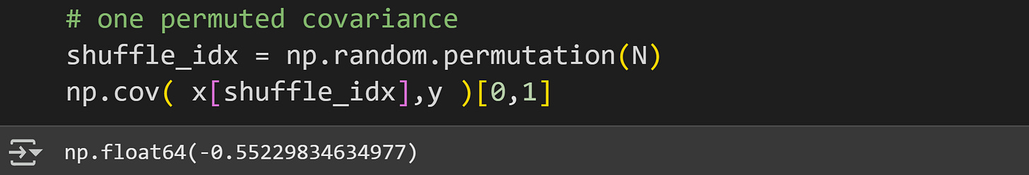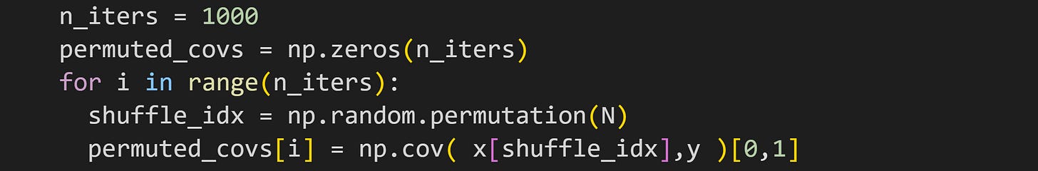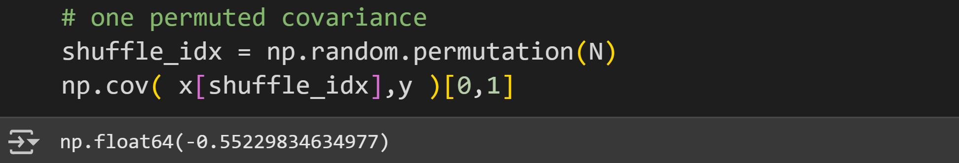 But that code gives us just one permuted covariance value. The next step is to repeat that procedure many times in a for-loop.