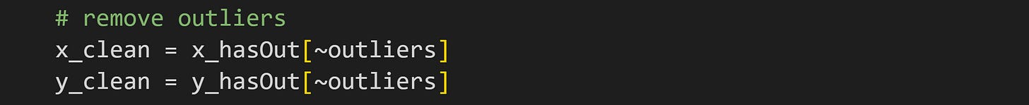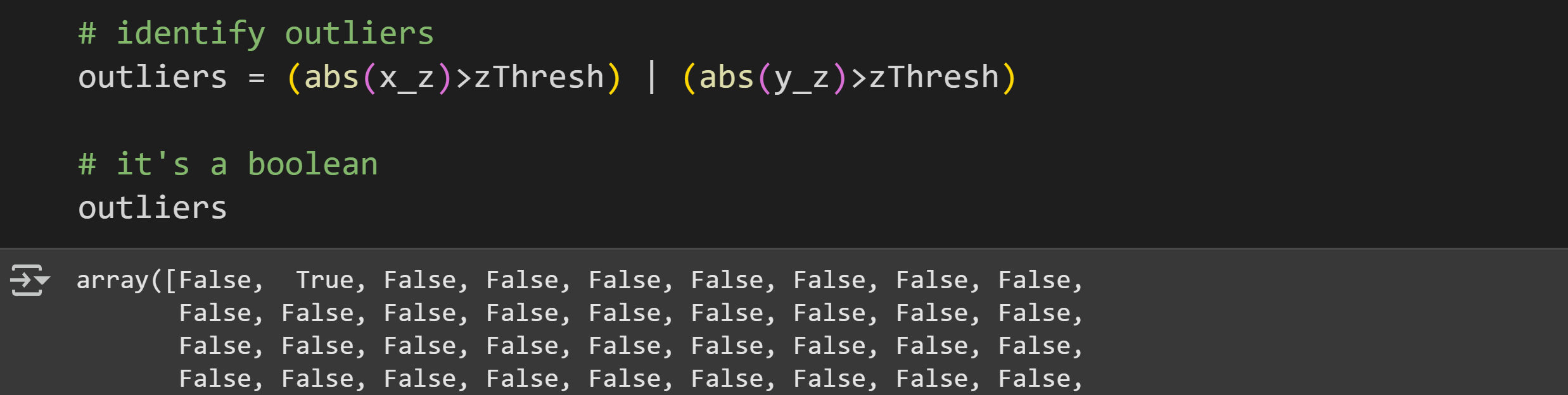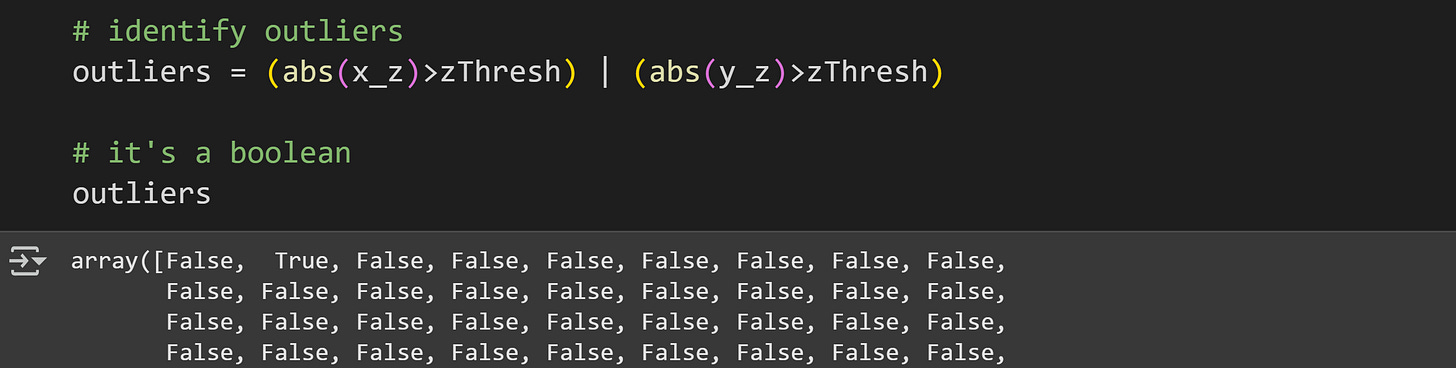 Anyway, now let’s identify those outliers so we can re-calculate covariance without them. The code below shows how I identified pairs of data values in which at least one variable has an outlier.