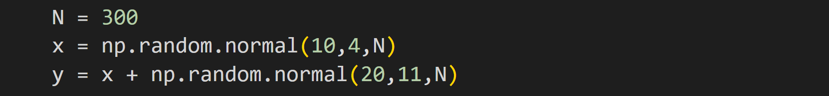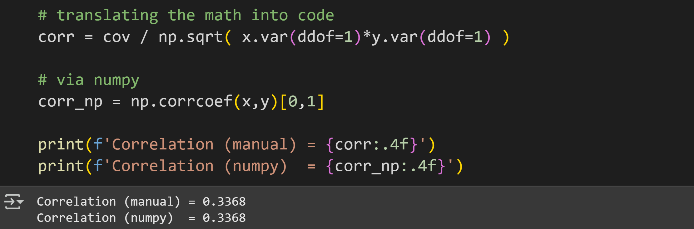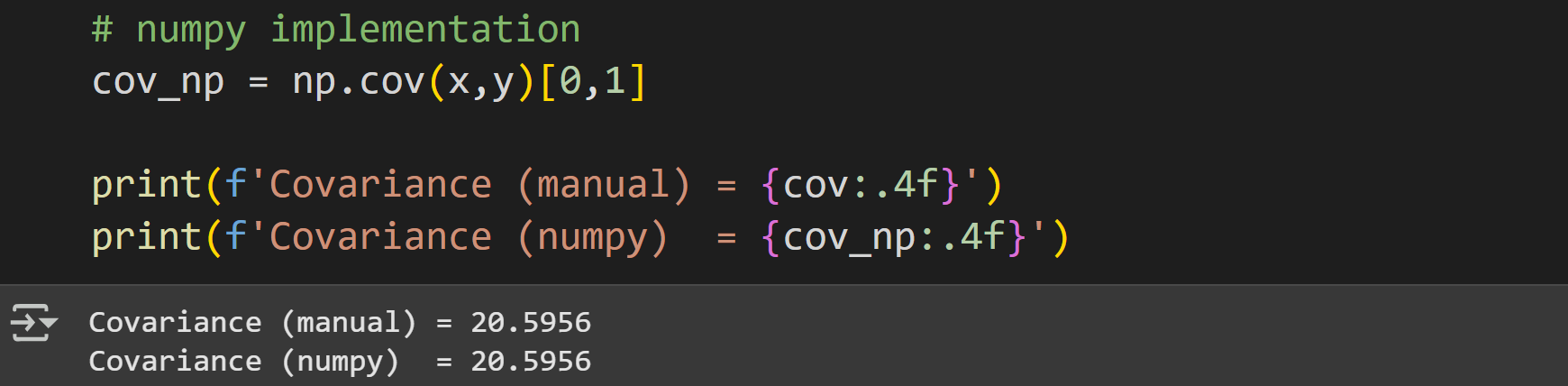 Notice how I index the variable cov_np; the np.cov() function returns a matrix of covariance values, which is useful for multivariable datasets. In this case, we have only two variables and so we need only one off-diagonal element.
