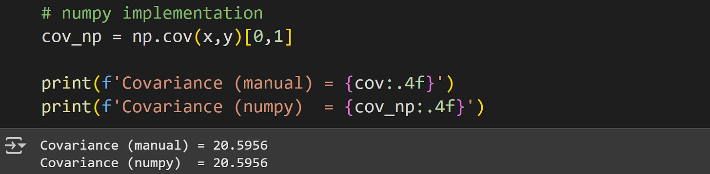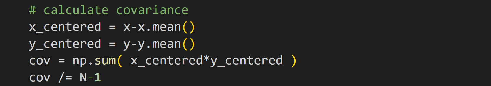 Now to calculate covariance. The code below is a direct translation of the math formula I showed earlier.