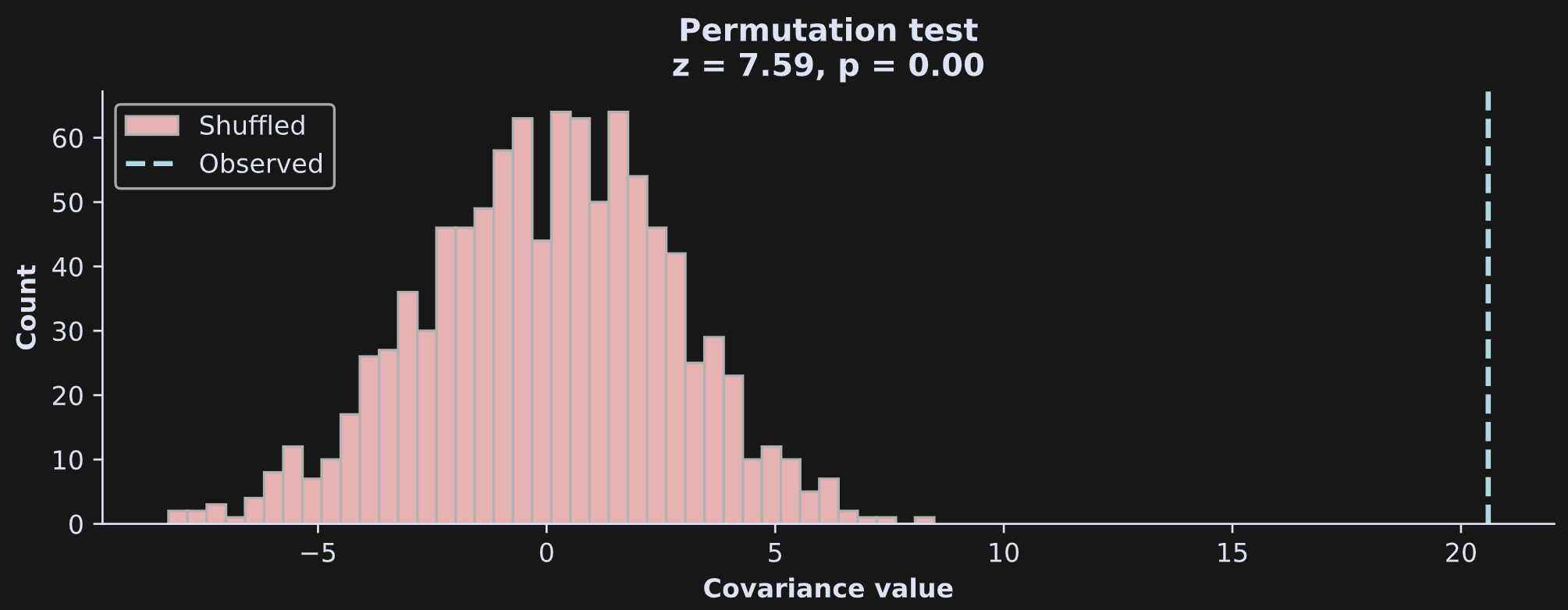 The p-value quantifies the probability that the observed value was due to random chance, and is defined as the number of permuted covariance values larger than the observed value. (There are other ways to calculate a permutation p-value, but I’ll use this one for consistency with the next two posts.)