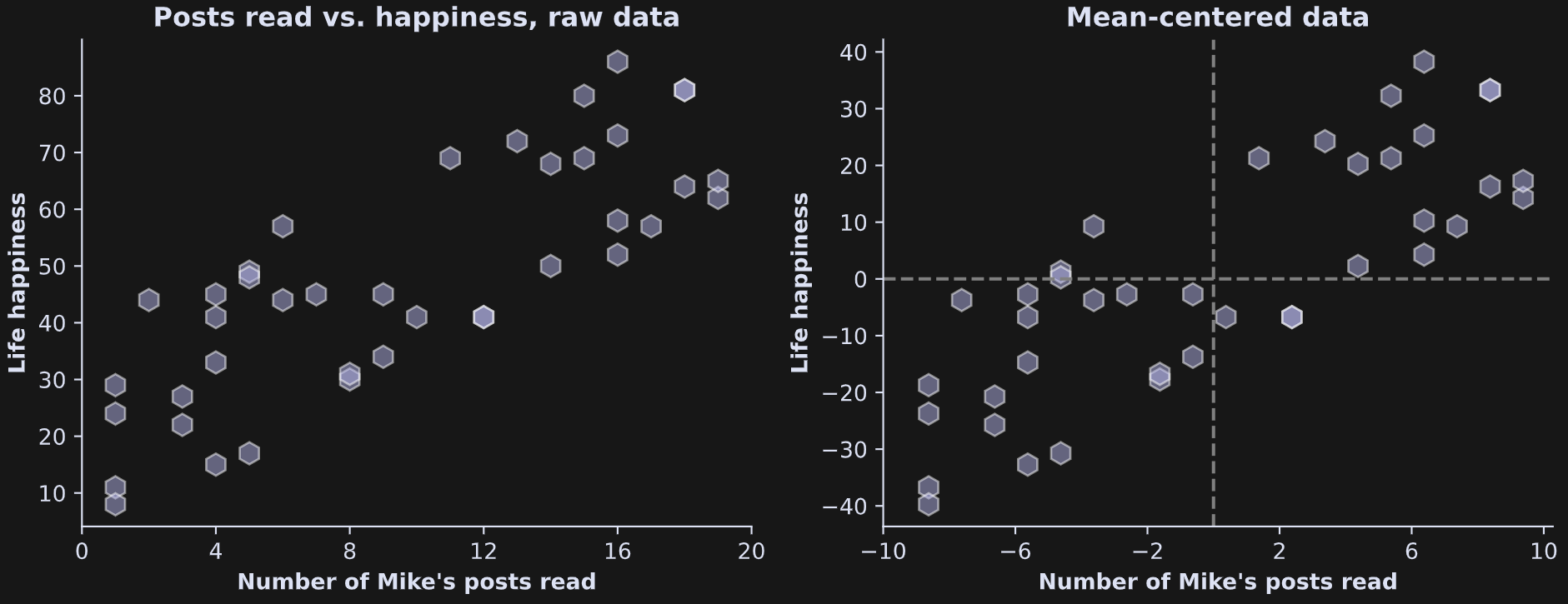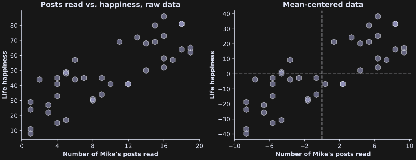Let’s start with a concrete example to help work through the equation. Imagine I surveyed some of my readers on Substack and got two data points from each person: the number of my Substack posts they’ve read, and their self-reported life happiness. The left panel in the figure below shows the raw data, and the right panel shows exactly the same data but mean-centered. You’ll understand why the data are mean-centered in a bit.