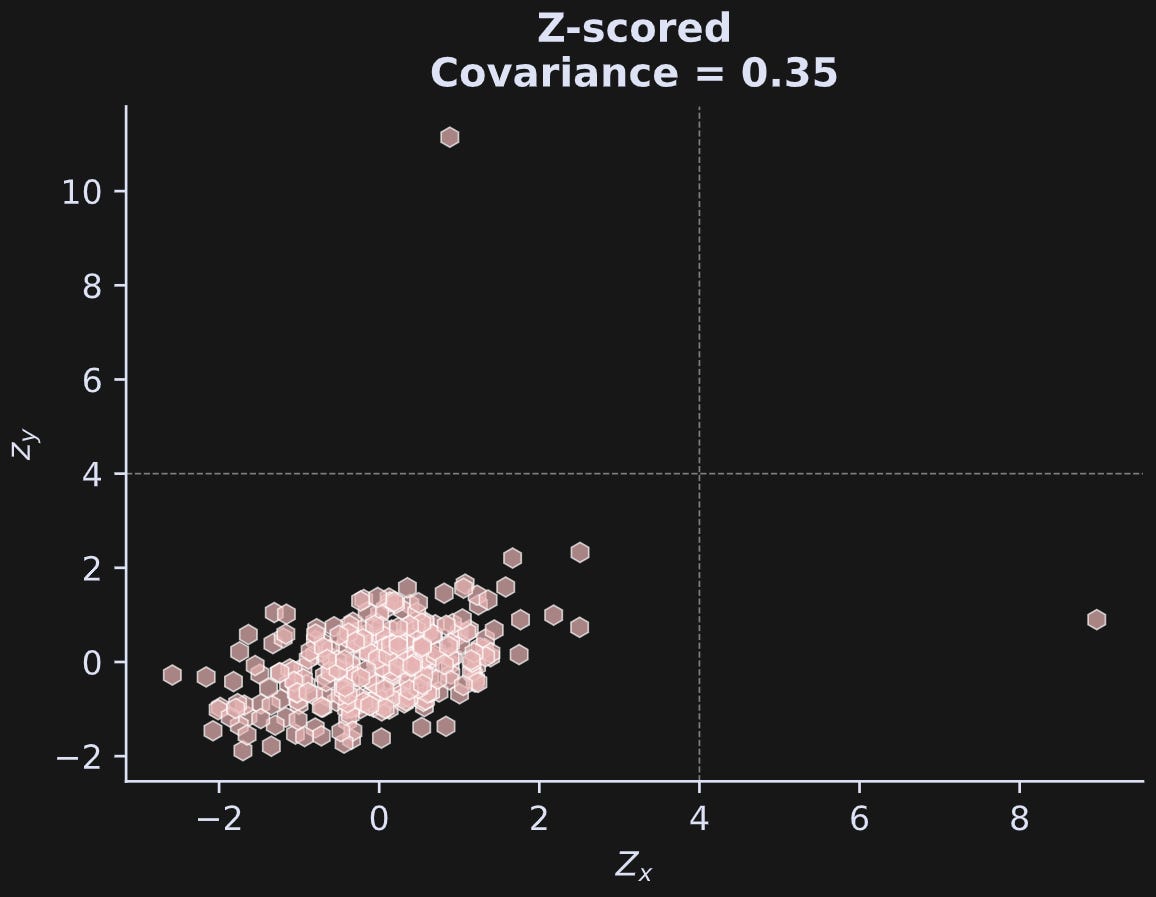 For covariance, outliers are harmful, and removing them is the right thing to do. To identify which outliers should be removed, you can define some z-score threshold, and then remove any data with a z-score greater than that threshold. |z|>4 is a reasonable common threshold — data values four standard deviations away from the mean are uncommon in normally distributed data.