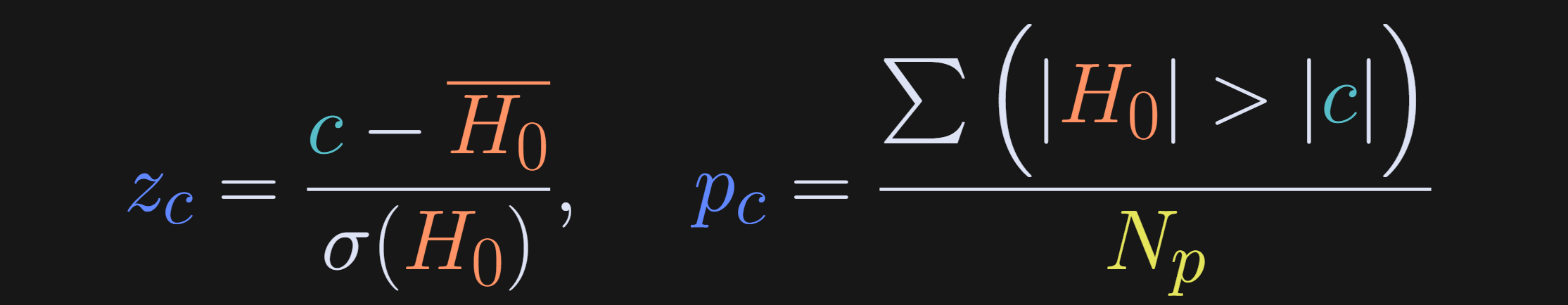 H0 is the null hypothesis distribution, σ() indicates the standard deviation, c is the observed covariance value (the vertical dashed line in the previous figure), and N_p is the number of permutations (1000 in the code demo).